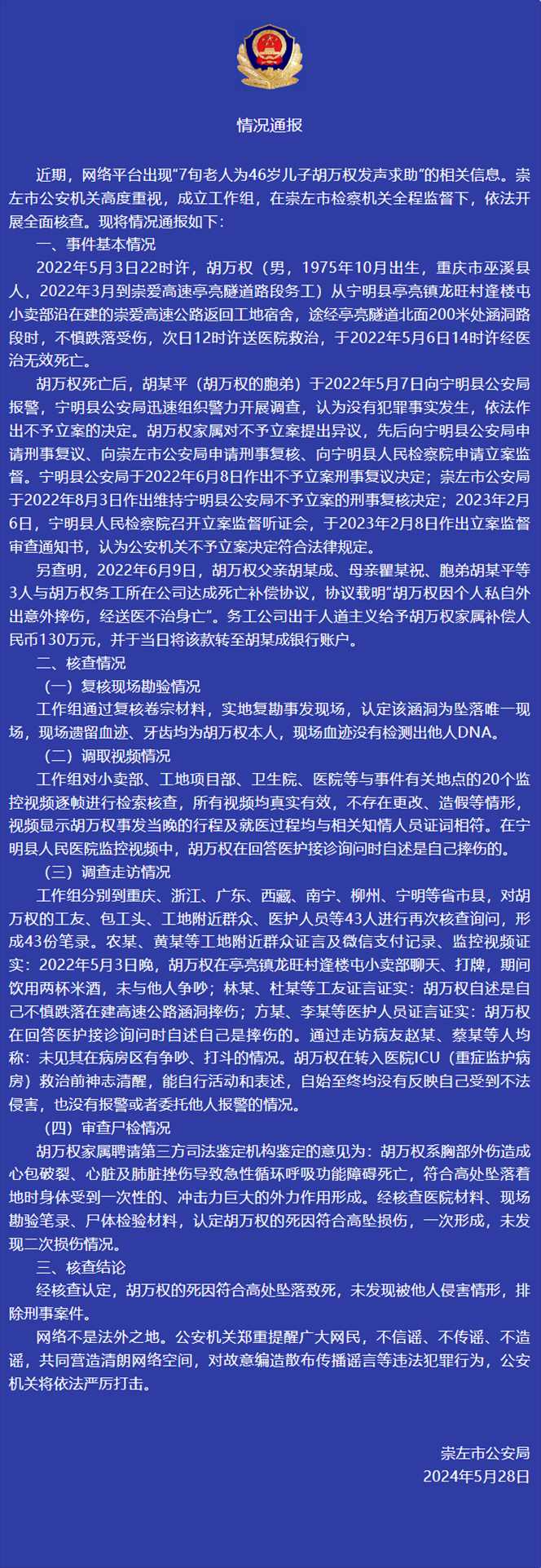 央視網(wǎng)消息:據(jù)“崇左警方”微信公眾號消息,廣西崇左市公安局5月28日通報,近期,網(wǎng)絡(luò)平臺出現(xiàn)“7旬老人為46歲兒子胡萬權(quán)發(fā)聲求助”的相關(guān)信息。崇左市公安機(jī)關(guān)高度重視,成立工作組,在崇左市檢察機(jī)關(guān)全程監(jiān)督下,依法開展全面核查。現(xiàn)將情況通報如下: