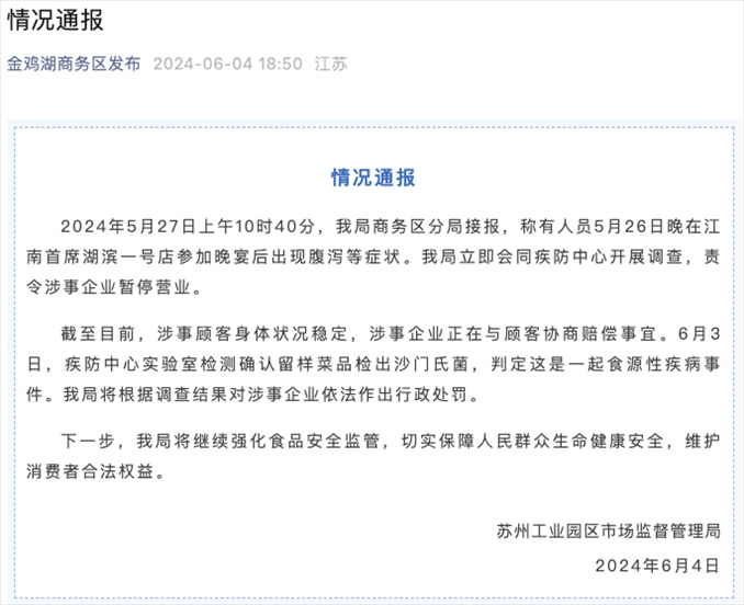 央視網(wǎng)消息:據(jù)蘇州工業(yè)園區(qū)市場監(jiān)督管理局通報,5月27日上午10時40分,商務區(qū)分局接報,稱有人員5月26日晚在江南首席湖濱一號店參加晚宴后出現(xiàn)腹瀉等癥狀。該局立即會同疾防中心開展調查,責令涉事企業(yè)暫停營業(yè)。