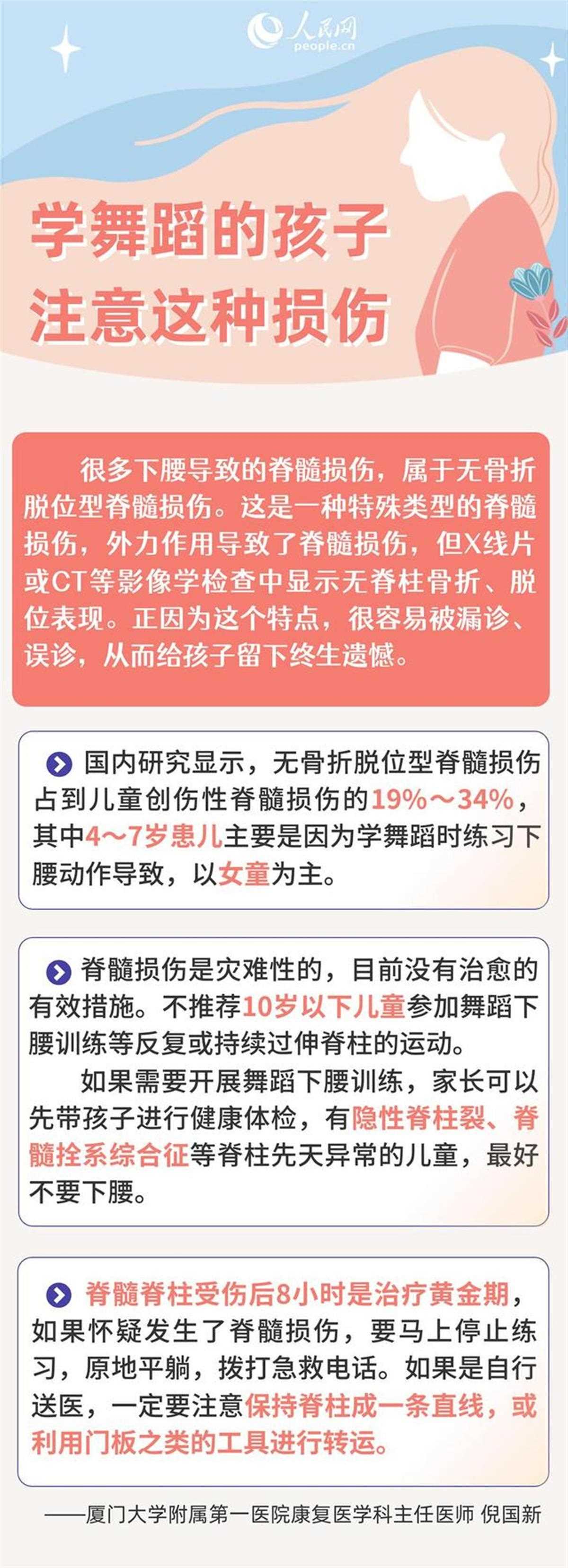 廈門大學(xué)附屬第一醫(yī)院康復(fù)醫(yī)學(xué)科主任醫(yī)師倪國新對記者表示,兒童練習(xí)舞蹈雖然好處多多,但需要注意的是,下腰、壓腿等動作存在一定的危險性,嚴重的甚至?xí)?dǎo)致截癱,在練習(xí)過程中要謹防脊髓損傷。