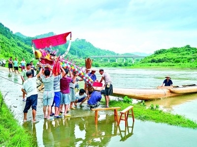 眾人抬著一艘近百米長(zhǎng)的特制龍舟前往河邊。