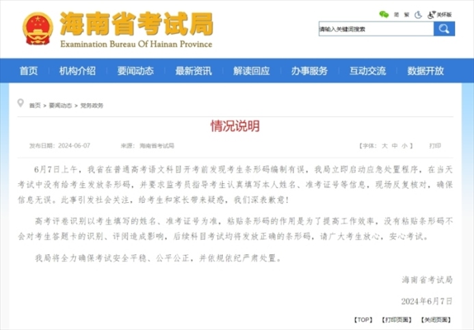·海南通報(bào)“高考語(yǔ)文卷未發(fā)條形碼”:不影響答題卡識(shí)別、評(píng)閱。