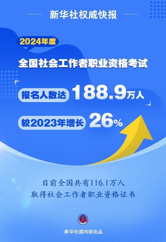新華社北京6月16日電(記者馮家順)2024年度全國社會工作者職業(yè)資格考試于6月15日至16日舉行。記者16日從中央社會工作部獲悉,今年考試報(bào)名人數(shù)達(dá)188.9萬人,較2023年增長26%,再創(chuàng)歷史新高。
