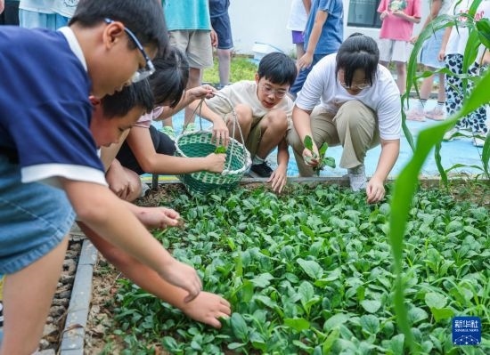 9月10日,東林小學的學生在學校菜園采收青菜。
