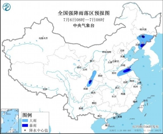 預(yù)計,7月6日08時至7日08時,吉林中東部、遼寧東部、陜西南部、山東南部、河南東部、安徽北部、江蘇北部、四川盆地西北部等地部分地區(qū)有大雨,其中,吉林中東部、遼寧東部、山東南部、江蘇北部、四川盆地西北部等地部分地區(qū)有暴雨(50~90毫米)。上述部分地區(qū)伴有短時強降水(最大小時降雨量20~50毫米,局地可超過60毫米);吉林東部、遼寧東部、山東南部、河南東部、安徽北部、江蘇北部等地的部分地區(qū)將有8-10級雷暴大風或冰雹天氣。中央氣象臺7月6日06時發(fā)布暴雨藍色預(yù)警和強對流天氣藍色預(yù)警。