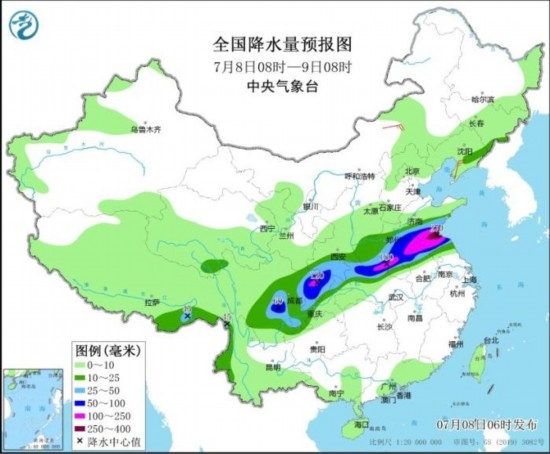 全國降水量預(yù)報圖(7月8日08時-9日08時)
