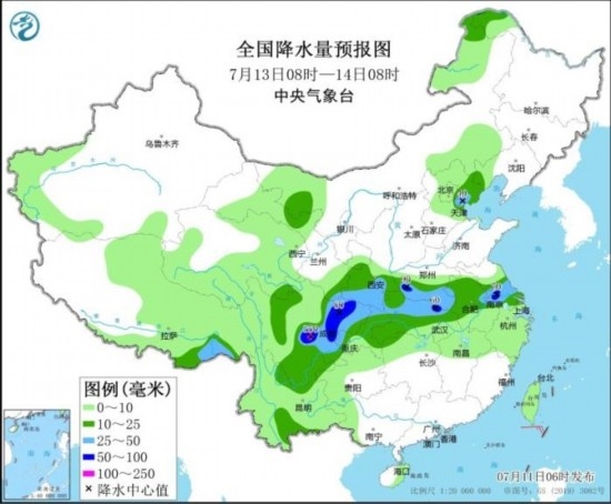 7月13日08時至14日08時,內蒙古西部、河北東北部、天津、西北地區(qū)東南部、黃淮西南部、江淮、江漢、江南北部、四川大部、重慶大部、云南南部和東北部等地部分地區(qū)有中到大雨,其中,四川中東部、河南西南部、江蘇西南部、湖北東北部等地部分地區(qū)有暴雨或大暴雨(100~150毫米)。