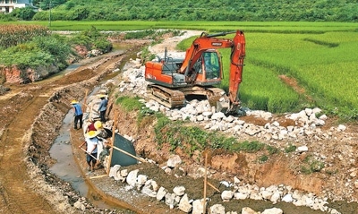 7月26日,湖南省洪江市巖垅鄉(xiāng)竹坪垅村,施工人員加緊修復(fù)被洪水沖毀的溪邊農(nóng)田???。楊錫建攝(人民視覺(jué))