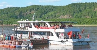 游客乘船在黑龍江上觀光、游玩。