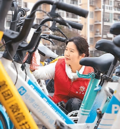 江西贛州興國(guó)縣長(zhǎng)征社區(qū)志愿者在街頭整理共享單車(chē)。陳 鵬攝(人民視覺(jué))
