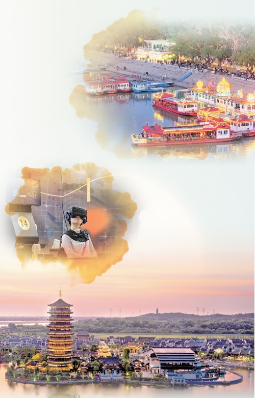 上圖:哈爾濱松花江畔,燈火璀璨、人流如織。施 覺攝 中圖:“尋境敦煌——數(shù)字敦煌沉浸展”中,游客借助VR設(shè)備游覽莫高窟。新華社記者 郎兵兵攝 下圖:晚霞映襯下的長沙銅官窯古鎮(zhèn)。長沙銅官窯文化旅游度假區(qū)供圖