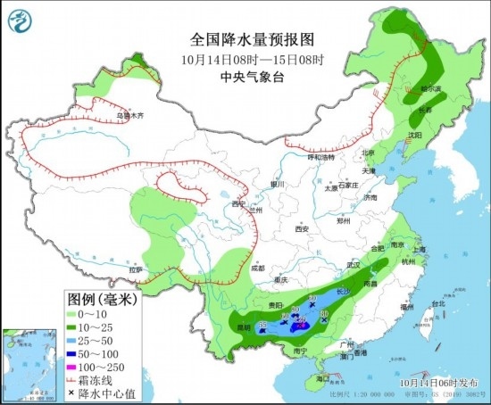 10月14日8時至15日8時,東北地區(qū)西部、云南東部、貴州南部、廣西中北部、湖南中部和西部、江西西北部等地部分地區(qū)有中到大雨,其中,云南東部、貴州南部、廣西北部、湖南西南部等地部分地區(qū)有暴雨或大暴雨(100~120毫米)。內蒙古東北部、黑龍江西北部、新疆北部高海拔山區(qū)有中到大雪,局地暴雪。內蒙古中部和北部、東北地區(qū)等地部分地區(qū)有5~6級風,陣風7~8級。