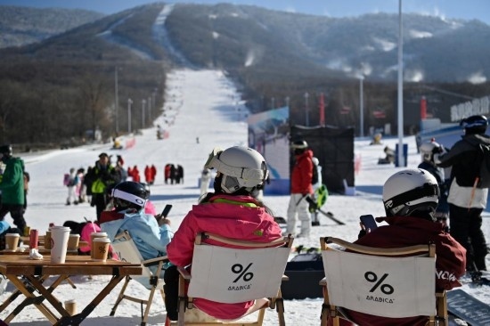 11月23日,滑雪愛(ài)好者在吉林市北大湖滑雪度假區(qū)的休息區(qū)喝咖啡。新華社記者 顏麟蘊(yùn) 攝