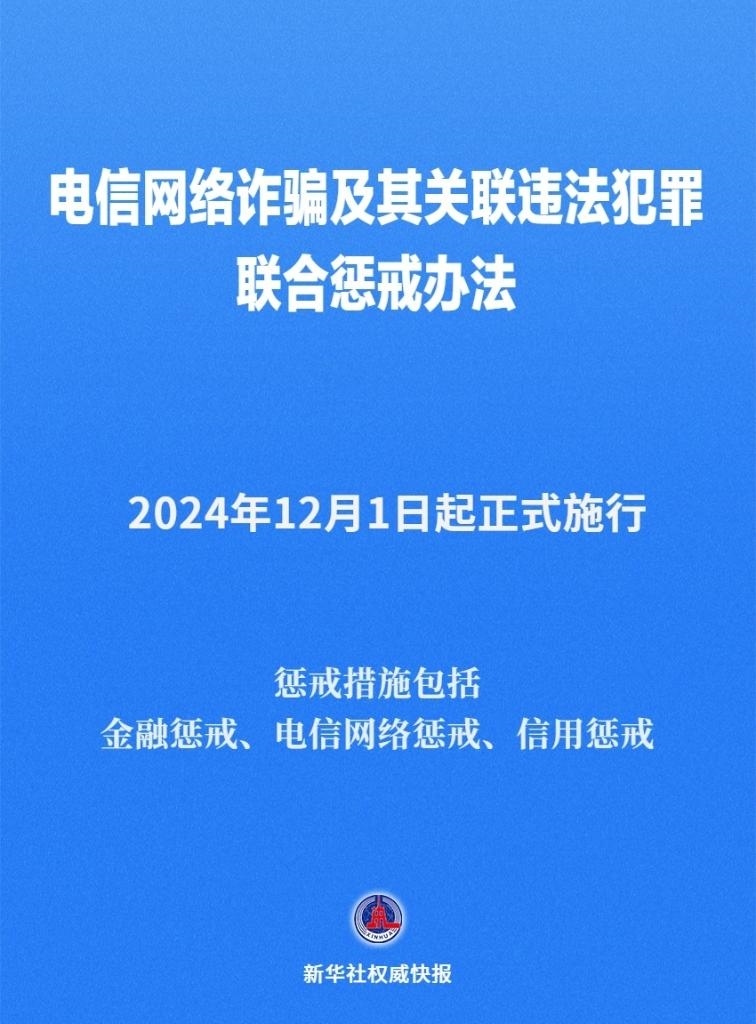 公安部11月26日召開新聞發(fā)布會,介紹公安部會同國家發(fā)展和改革委員會、工業(yè)和信息化部、中國人民銀行聯(lián)合印發(fā)《電信網(wǎng)絡(luò)詐騙及其關(guān)聯(lián)違法犯罪聯(lián)合懲戒辦法》,2024年12月1日起正式施行。
