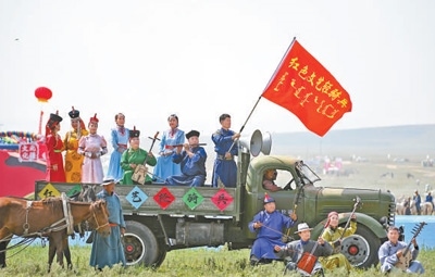 滋潤人心“紅色文藝輕騎兵”烏蘭牧騎隊員在內(nèi)蒙古草原那達(dá)慕開幕式上表演。新華社記者 貝 赫攝