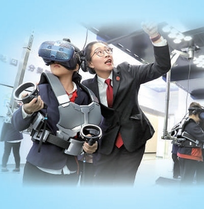 在浙江湖州市南潯區(qū)未成年人道德法治體驗館,南潯區(qū)人民法院法官(右一)指導小學生運用虛擬現(xiàn)實體驗設(shè)備接受法治教育。項 飛攝
