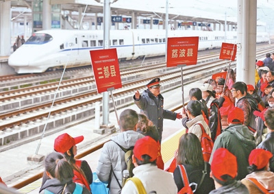 “廣州南站開辟了綠色通道,安排工作人員和志愿者在站臺(tái)、出站口、停車場(chǎng)等地提供咨詢指引、行李搬運(yùn)等服務(wù),讓返崗更順暢?!睆V州南站值班站長(zhǎng)謝海介紹。