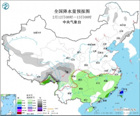 2月12日08時至13日08時,內蒙古東北部、吉林東部、遼寧東部、新疆南疆西部山區(qū)、西藏東部、青海南部、川西高原、云南西北部、貴州西部等地的部分地區(qū)有小到中雪或雨夾雪,其中,西藏東部局地有大到暴雪(10~12毫米)。西藏東南部、福建南部、廣東東部、臺灣島等地的部分地區(qū)有中到大雨,其中,臺灣島中部局地有暴雨(50~60毫米)。內蒙古中東部、河北北部、山東半島、西藏南部、川西高原等地的部分地區(qū)有4~5級風;黃海、東海、臺灣海峽、南海北部海域等海域有6~7級風。