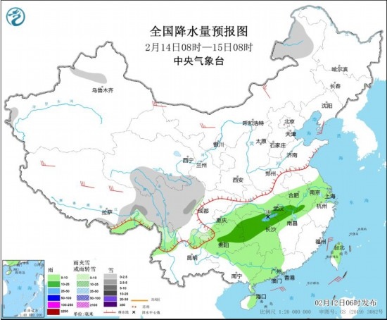 2月13日08時至14日08時,新疆伊犁河谷和南疆盆地南部、西藏東部、青海中南部、甘肅西南部、川西高原北部、云南西北部等地的部分地區(qū)有小到中雪或雨夾雪,其中,西藏東部、云南西北部等地局地有大到暴雪(10~15毫米)。西藏東南部、四川東部、重慶、貴州中北部、湖南北部、湖北南部、江西北部、安徽西南部、海南島東部、臺灣島等地的部分地區(qū)有小到中雨,其中,西藏東南部、臺灣島中南部等地局地有大雨(25~35毫米)。內蒙古中部、遼東半島、西藏中北部、云南北部等地的部分地區(qū)有4~6級風;東海南部、臺灣海峽、巴士海峽、南海北部等海域有6~7級風。