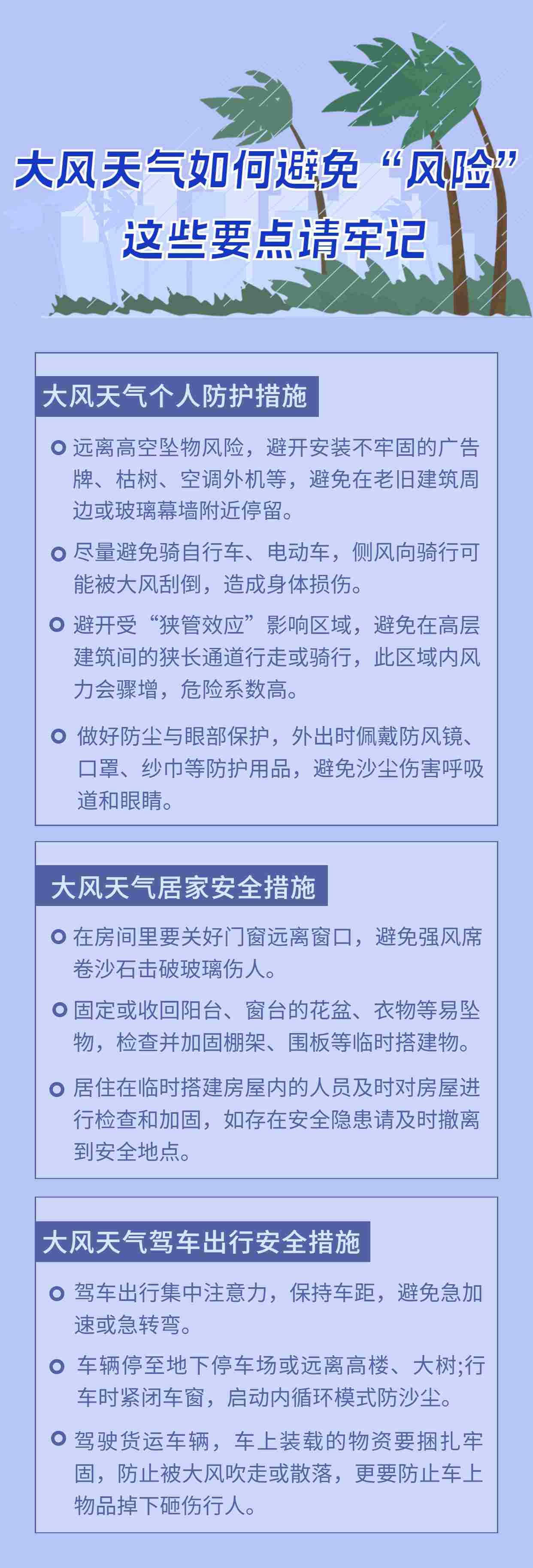 據(jù)氣象部門預(yù)報,未來幾日,全國多地將出現(xiàn)強風(fēng)天氣,部分地區(qū)陣風(fēng)風(fēng)力可達(dá)12~13級。春季到來,大風(fēng)天氣增多,給我們的生活帶來了諸多安全隱患。該如何做好防范?一起來了解。