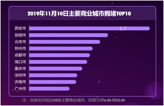 高德地圖對國內(nèi)20座重點商業(yè)城市的全天擁堵指數(shù)預(yù)測顯示,西安以相較平時周末增長8%的數(shù)字領(lǐng)跑全國,擁堵延時指數(shù)達(dá)到1.73,明顯超過排名第二的昆明,成為今年“天貓雙11”線下出行最為“火爆”的城市。