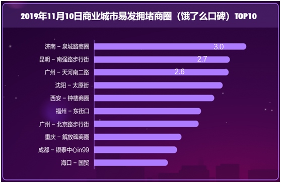 口碑餓了么線下商戶所在區(qū)域易發(fā)生擁堵商圈排名前十位的依次是,濟(jì)南泉城路、昆明南強步行街、廣州天河南二路、沈陽太原街、西安鐘樓、福州東街口、廣州北京路步行街、重慶解放碑、成都銀泰中心in99和??趪Q(mào)。