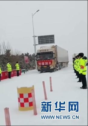2月14日,內蒙古多地普降大雪,從赤峰出發(fā)的運輸車輛,在當地交警的護送下順利踏上征途。沿途的交警列隊敬禮,目送車隊離去。