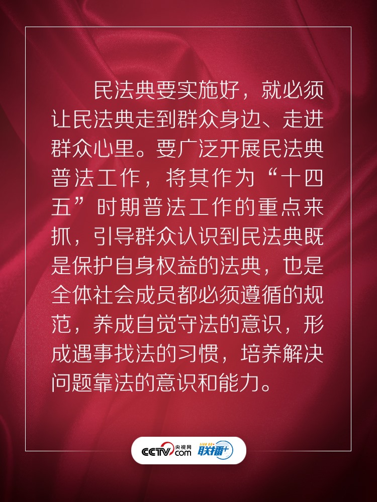 民法典回應(yīng)了人民的期待,充滿了以人民為中心的底色。央視網(wǎng)《聯(lián)播+》特梳理習(xí)近平總書記相關(guān)話語,與您一起學(xué)習(xí)感悟。