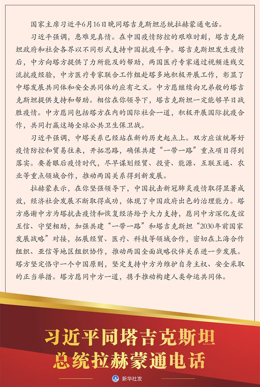 習近平強調(diào),患難見真情。在中國疫情防控的艱難時刻,塔吉克斯坦政府和社會各界以不同形式支持中國抗疫斗爭。塔吉克斯坦發(fā)生疫情后,中方向塔方提供了力所能及的幫助,兩國醫(yī)療專家通過視頻連線交流抗疫經(jīng)驗,中方醫(yī)療專家聯(lián)合工作組赴塔多地積極開展工作,彰顯了中塔發(fā)展共同體和安全共同體的應有之義。中方愿繼續(xù)向兄弟般的塔吉克斯坦提供支持和幫助。相信在你領(lǐng)導下,塔吉克斯坦一定能夠早日戰(zhàn)勝疫情。中方愿同包括塔方在內(nèi)的國際社會一道,積極開展國際抗疫合作,共同打贏這場全球公共衛(wèi)生保衛(wèi)戰(zhàn)。