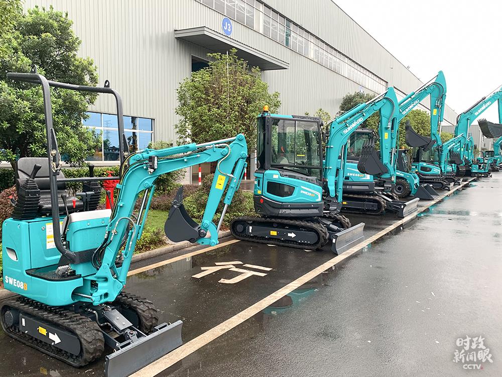 △這是不同型號的微型挖掘機(jī),特點(diǎn)是動臂可偏轉(zhuǎn),底盤可伸縮,適合城市改造、農(nóng)田水利等小規(guī)模項(xiàng)目。(總臺央視記者章猛拍攝)