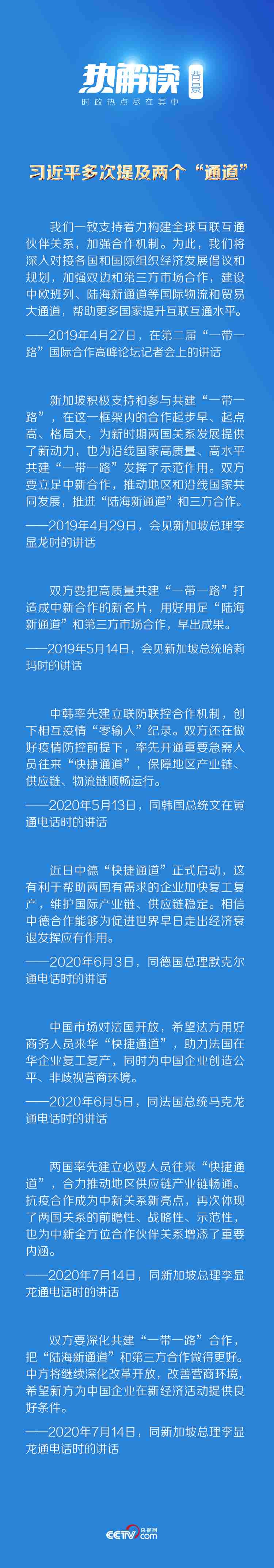 7月14日,習(xí)近平主席同新加坡總理李顯龍通電話(huà)。他在通話(huà)中表示,“疫情發(fā)生以來(lái),中新兩國(guó)政府和各界互施援手,守望相助”,并特別提到了“快捷通道”和“陸海新通道”這兩條“通道”。