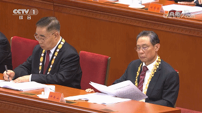 △鐘南山、張伯禮、張定宇、陳薇就座主席臺上。
