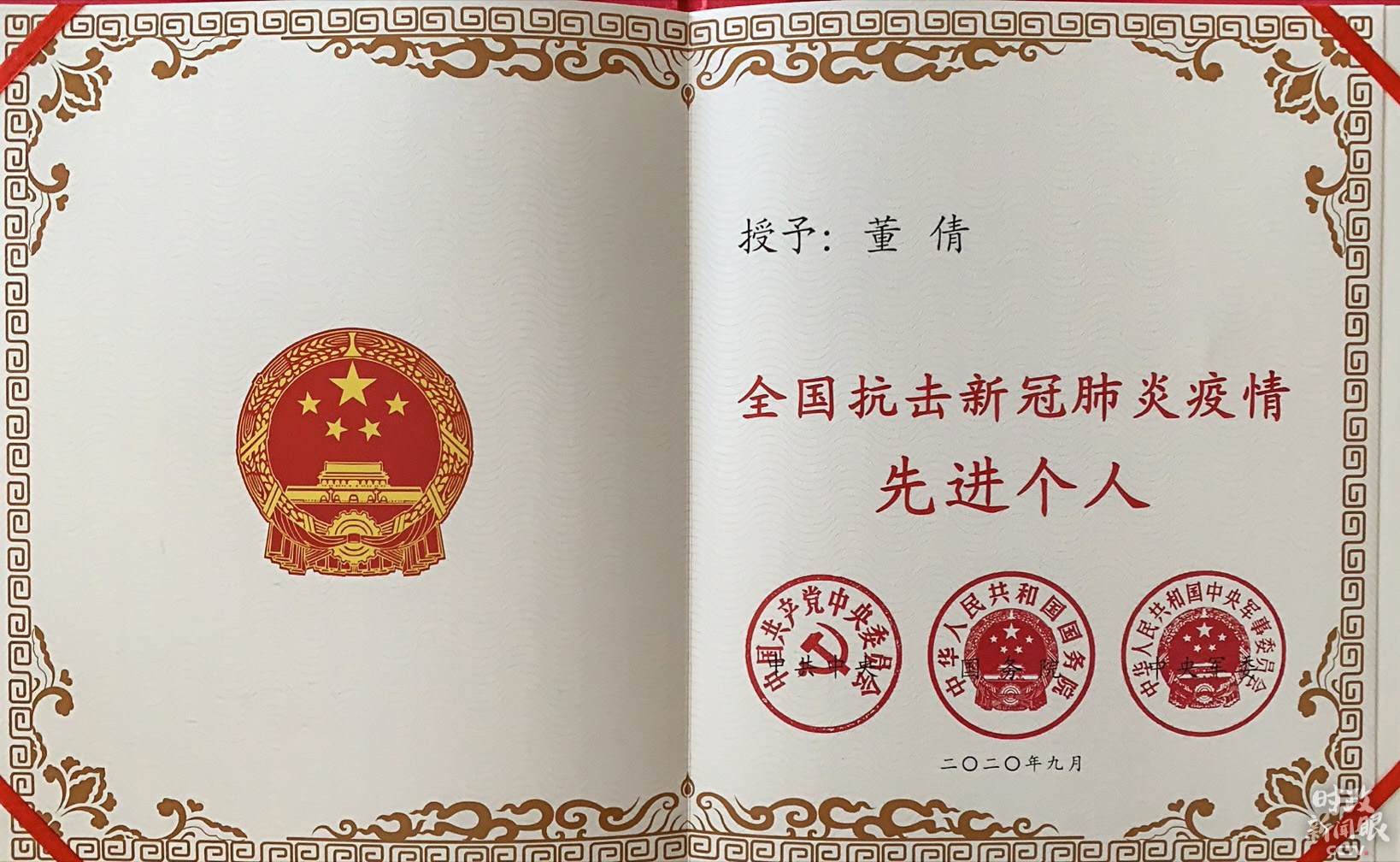 △全國抗擊新冠肺炎疫情先進(jìn)個人獎?wù)潞妥C書。(總臺央視記者張淳拍攝)