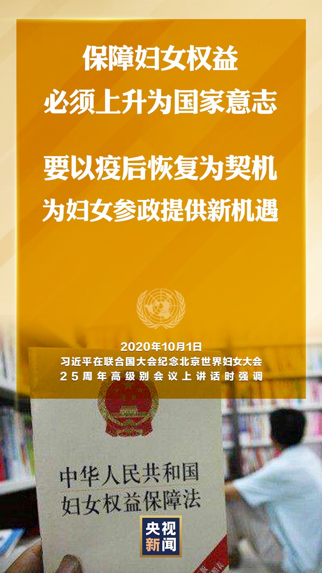 國(guó)家主席習(xí)近平10月1日在聯(lián)合國(guó)大會(huì)紀(jì)念北京世界婦女大會(huì)25周年高級(jí)別會(huì)議上通過視頻發(fā)表重要講話。就如何切實(shí)保護(hù)婦女權(quán)益,習(xí)近平提出中國(guó)主張。