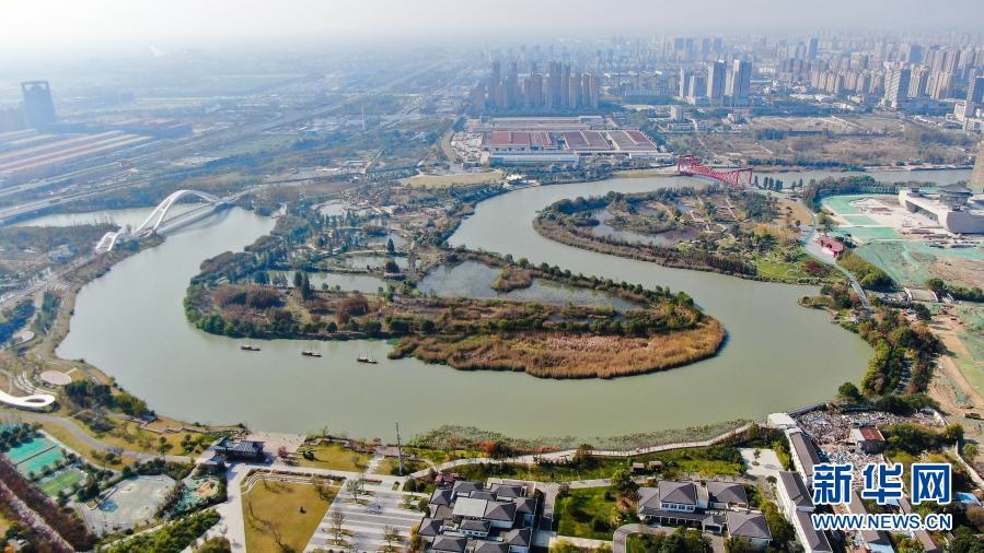 這是11月14日拍攝的江蘇省揚(yáng)州市運河三灣生態(tài)文化公園景色(無人機(jī)照片)。新華社記者 季春鵬 攝