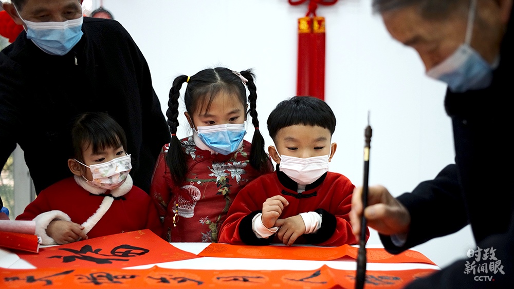 △金元社區(qū)居民活動室內,孩子們觀摩書法寫作。(總臺央視記者王哈男拍攝)