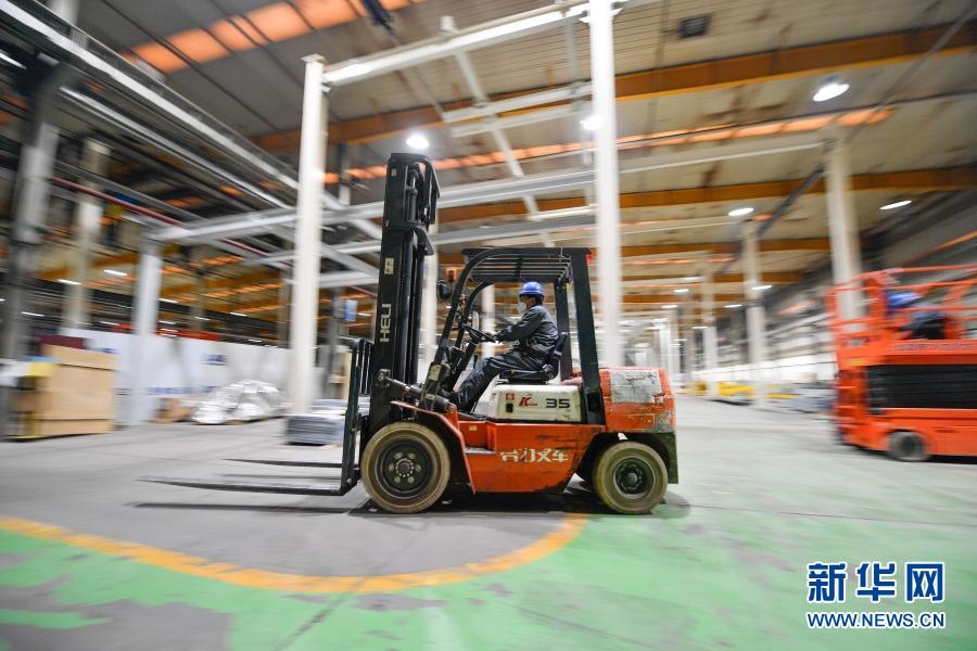 在中汽(天津)汽車(chē)裝備有限公司車(chē)間,工人在操作叉車(chē)(2月14日攝)。新華社發(fā)(孫凡越攝)