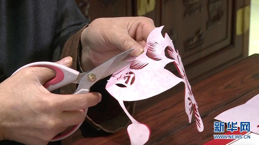 2月9日,“北京剪紙”非物質(zhì)文化遺產(chǎn)傳承人徐陽(yáng)在書(shū)桌前剪紙,喜迎新春(視頻截圖)。新華社發(fā)