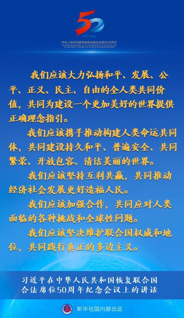 2021年10月25日,國家主席習近平在北京出席中華人民共和國恢復(fù)聯(lián)合國合法席位50周年紀念會議并發(fā)表重要講話。新華社記者李響攝