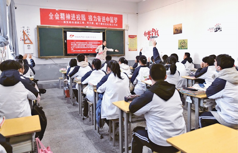 2021年11月24日,安徽省安慶市大觀區(qū)集賢路街道團工委、碟子塘社區(qū)紅領(lǐng)工作站聯(lián)合開展黨的十九屆六中全會精神宣講進(jìn)校園活動。中新社發(fā)項順平/攝