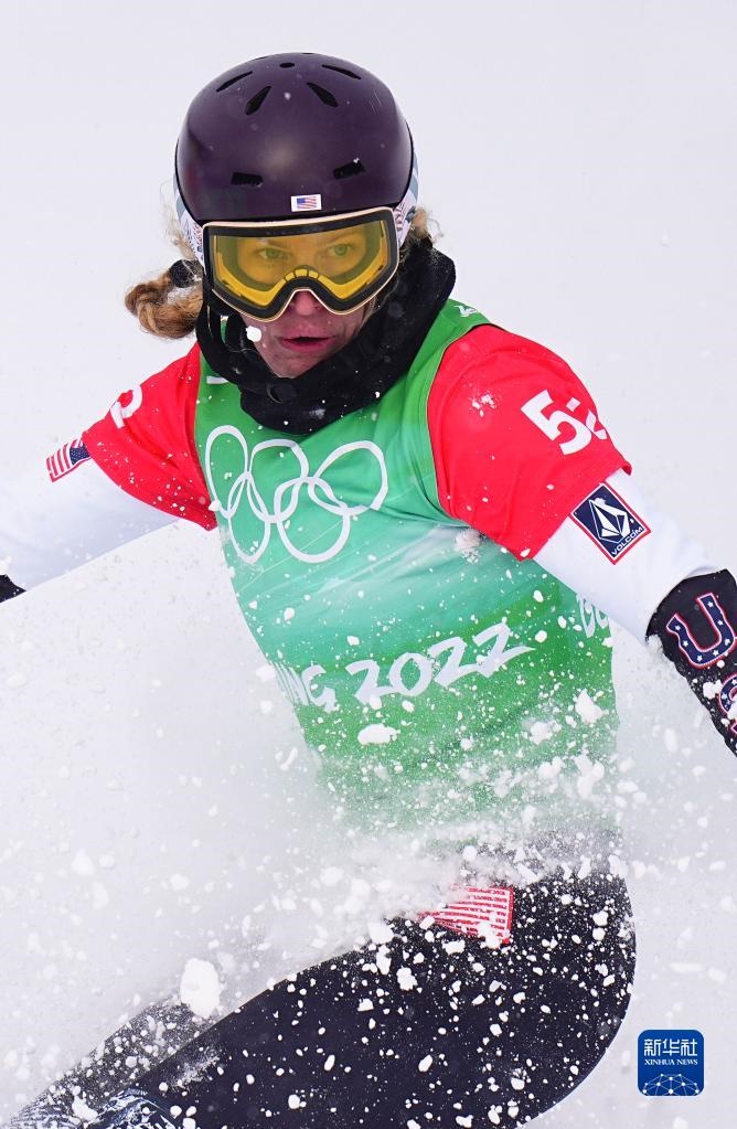 2月12日,美國選手琳賽·雅各貝利斯在比賽中。美國選手尼克·鮑姆加特納和琳賽·雅各貝利斯組成的美國一隊獲得單板滑雪障礙追逐混合團(tuán)體比賽的冠軍。新華社記者 許暢 攝