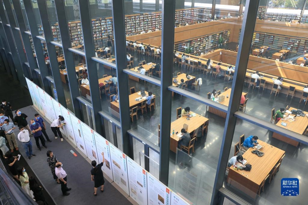 在北京國(guó)家圖書(shū)館,工作人員在介紹“經(jīng)典,予生活以詩(shī)意——‘文津經(jīng)典誦讀’十周年主題展”(2022年9月7日攝)。新華社記者殷剛攝