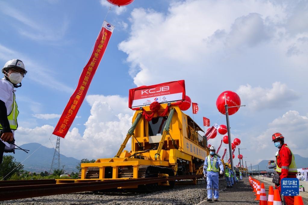 工作人員在印度尼西亞萬(wàn)隆雅萬(wàn)高鐵鋪軌施工現(xiàn)場(chǎng)作業(yè)(2022年4月20日攝)。新華社記者徐欽攝