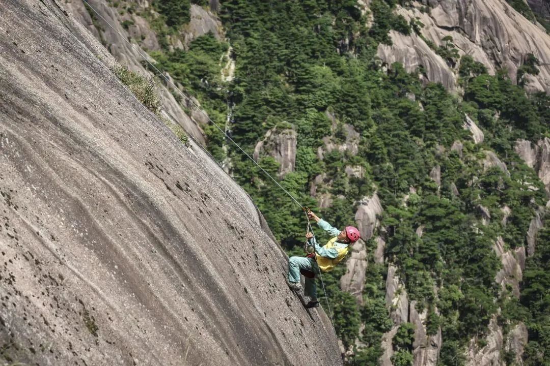 李培生是黃山景區(qū)的一名環(huán)衛(wèi)放繩工。這份工作需要在懸崖峭壁上揀拾隨風落向山谷的塑料袋、游客掉下的物品。