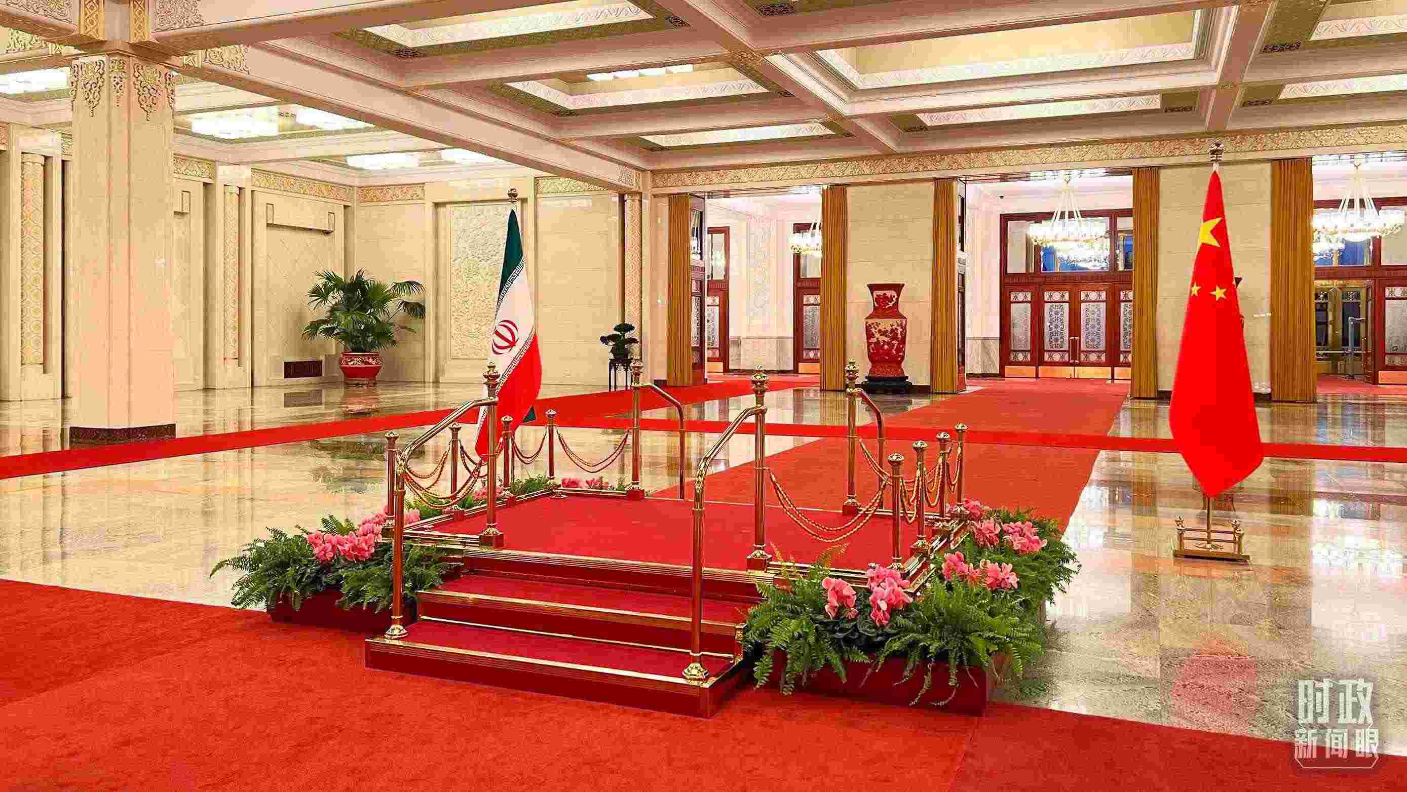 △2月14日會談現(xiàn)場的中伊兩國國旗。(總臺央視記者郁振一拍攝)