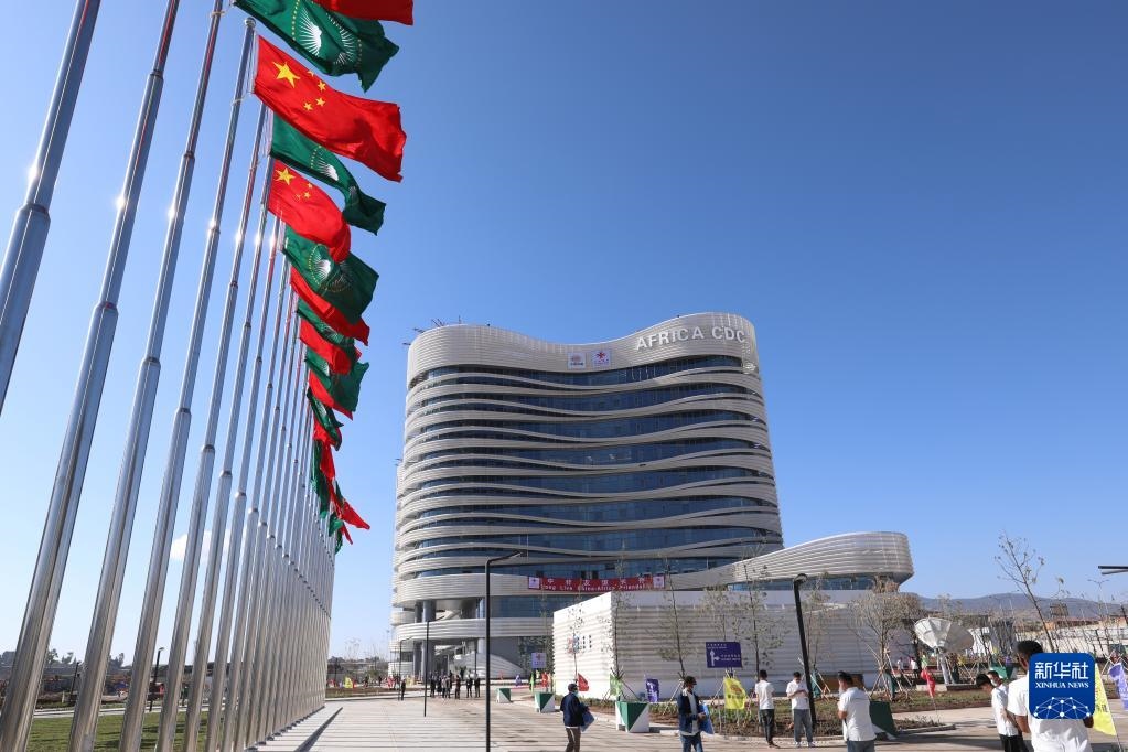 2023年1月11日,埃塞俄比亞首都亞的斯亞貝巴南郊,五星紅旗和非盟會旗迎風飄展,中國援非盟非洲疾控中心總部(一期)項目竣工儀式在這里舉行。