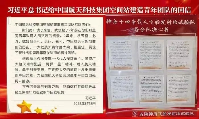 2022年5月2日,習(xí)近平總書記給中國航天科技集團(tuán)空間站建造青年團(tuán)隊回信,高度肯定航天青年,殷切期待青春奮斗。他強(qiáng)調(diào):“希望廣大航天青年弘揚(yáng)‘兩彈一星’精神、載人航天精神,勇于創(chuàng)新突破,在逐夢太空的征途上發(fā)出青春的奪目光彩,為我國航天科技實(shí)現(xiàn)高水平自立自強(qiáng)再立新功。”一年來,五院人持續(xù)學(xué)習(xí)重溫、堅決貫徹落實(shí)習(xí)近平總書記重要回信精神和關(guān)于航天強(qiáng)國建設(shè)的重要指示批示精神,始終做到牢記囑托、感恩奮進(jìn),交出非凡“答卷”。