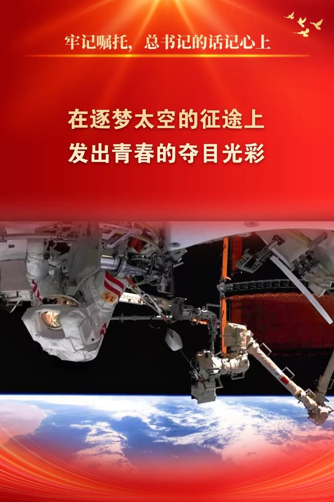 2013年5月4日,習(xí)近平總書記到航天科技集團(tuán)五院參加“實(shí)現(xiàn)中國夢、青春勇?lián)?dāng)”主題團(tuán)日活動時指出:“我們同青年朋友們到航天城來,就是要實(shí)地感受載人航天精神,激勵包括廣大青年在內(nèi)的全國各族人民為實(shí)現(xiàn)中華民族偉大復(fù)興的中國夢而奮斗?!笔陙恚逶喝耸冀K堅定沿著黨指引的方向前進(jìn),圓滿完成了以載人航天、探月探火、北斗導(dǎo)航等為代表的一系列航天重大工程任務(wù)。