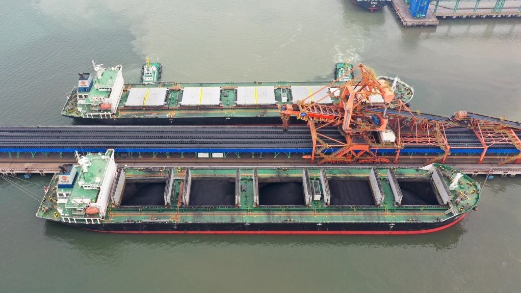 5月11日,船舶??吭邳S驊港煤炭港區(qū)碼頭(無(wú)人機(jī)照片)。新華社記者 駱學(xué)峰 攝