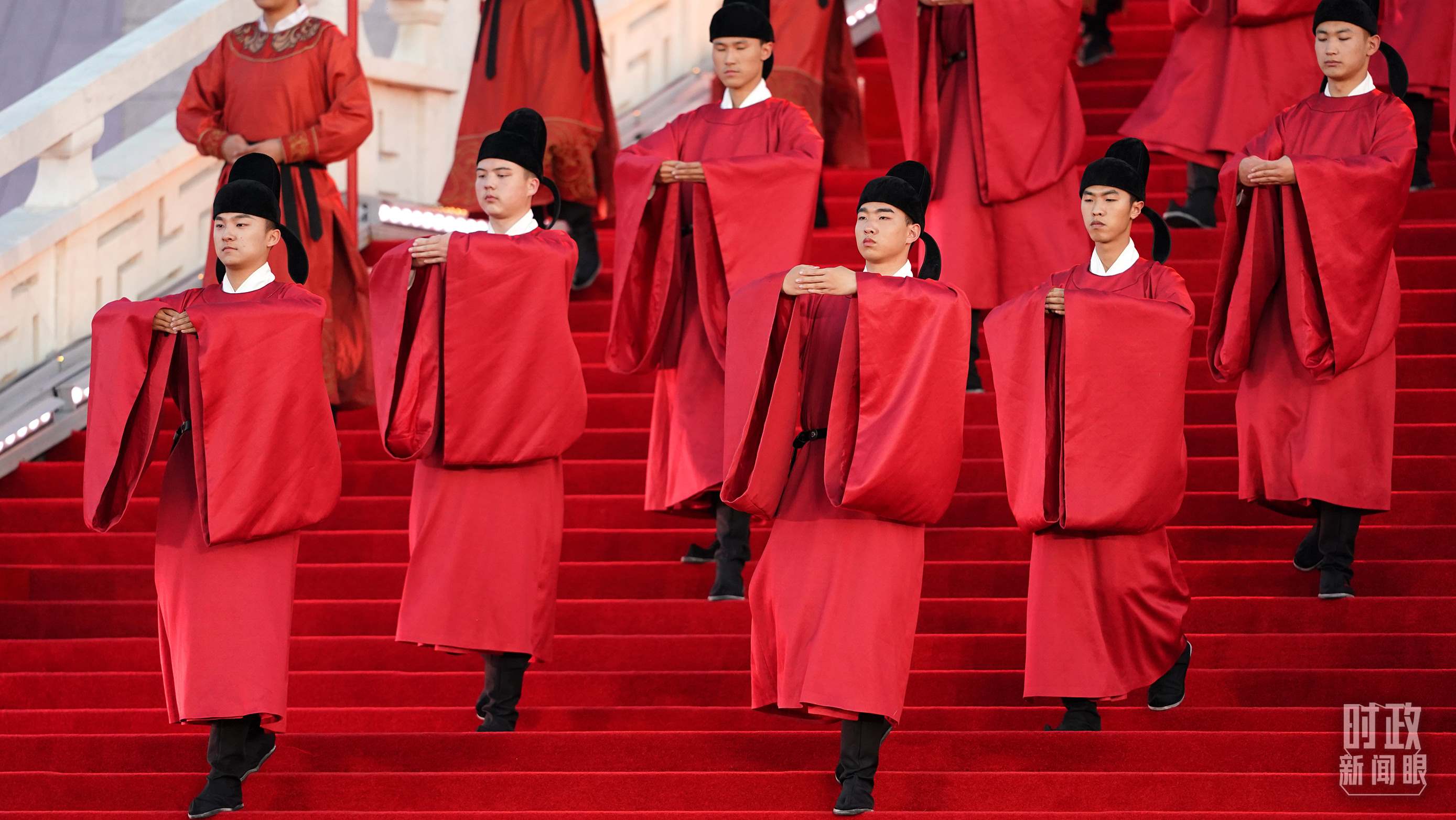 比如,迎賓表演中身著唐代紅色官服的男子,雙手平伸,指尖交錯(cuò),左手在外,掌心向內(nèi),舉手至額,欠身行禮,以中國(guó)傳統(tǒng)的“天揖禮”表達(dá)對(duì)賓客的敬意。