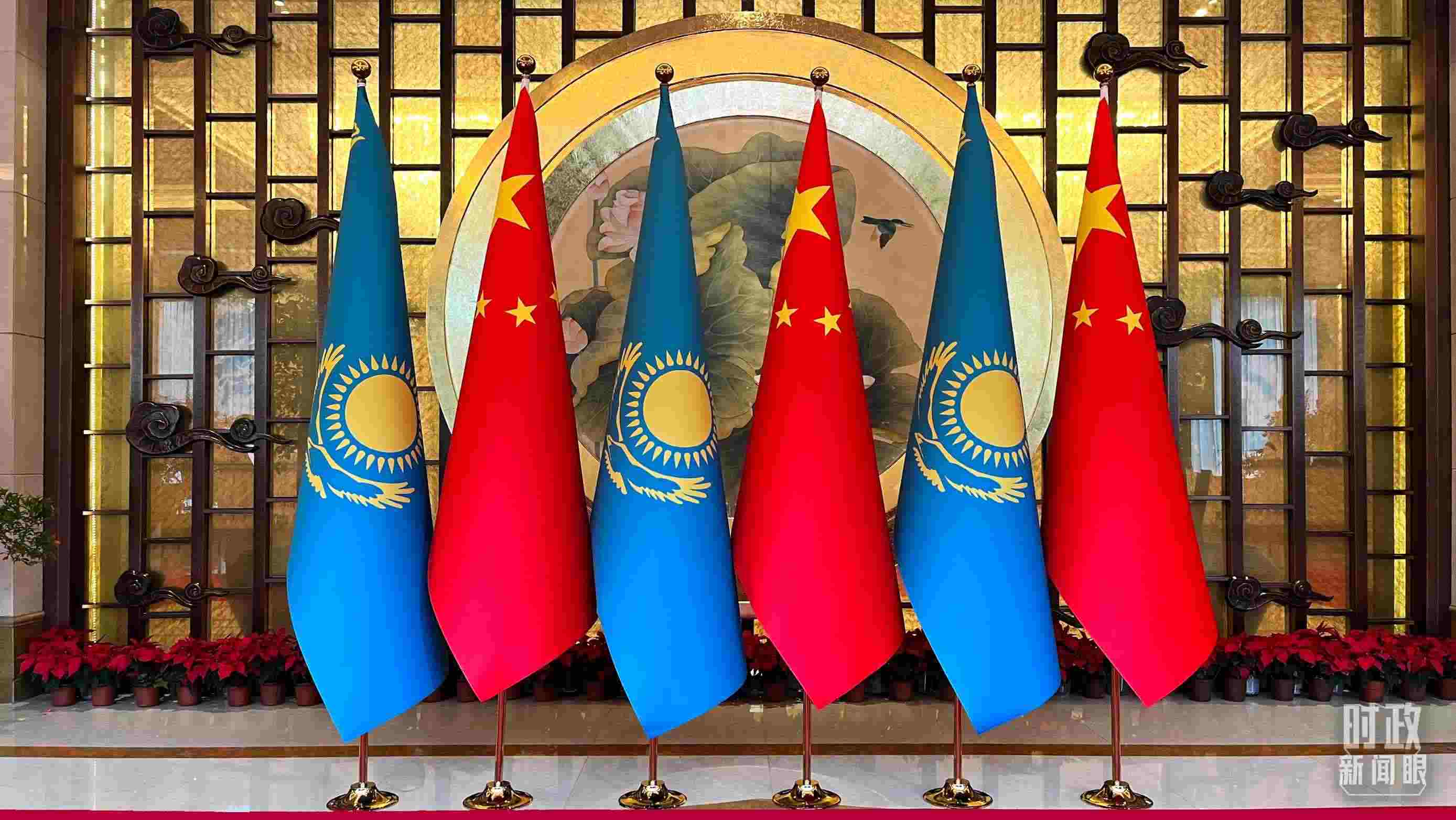 △中哈兩國(guó)元首會(huì)談現(xiàn)場(chǎng)外布置的兩國(guó)國(guó)旗。(總臺(tái)央視記者陸泓宇拍攝)
